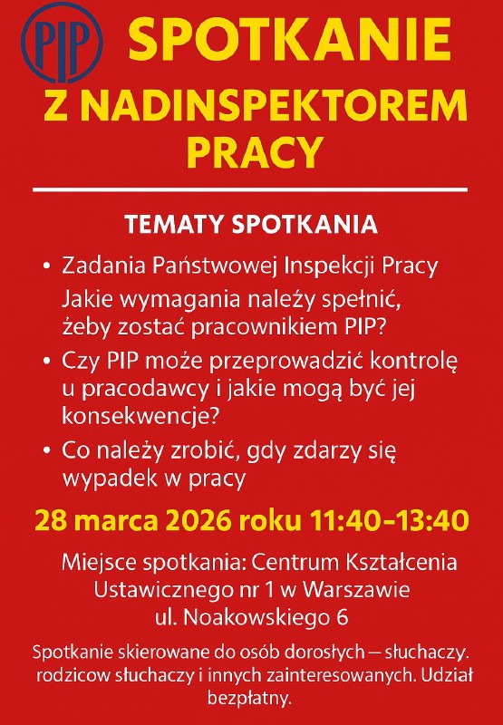 W dniu 28 marca b.r. o godz. 11.40. zapraszamy wszystkich zainteresowanych tematyką prawa pracy i bhp na spotkanie z nadinspektorem pracy z Okręgowego Inspektoratu Pracy w Warszawie, który w ciekawy sposób przybliży zagadnienia niezwykle przydatne w życiu każdego pracownika.